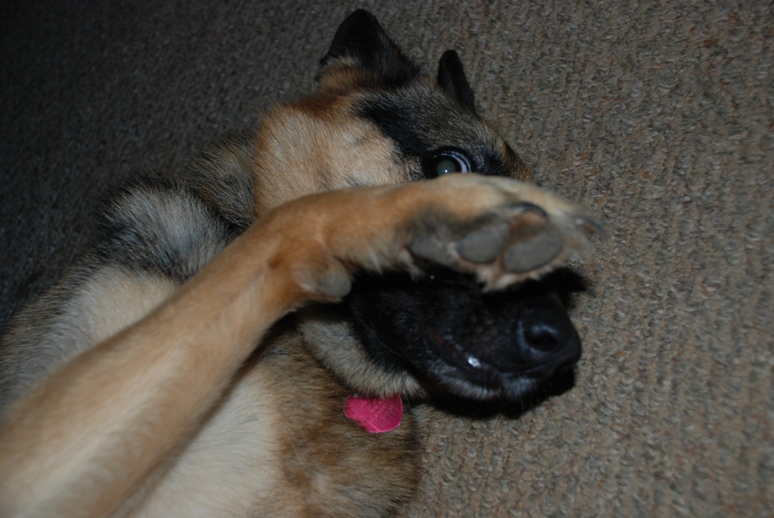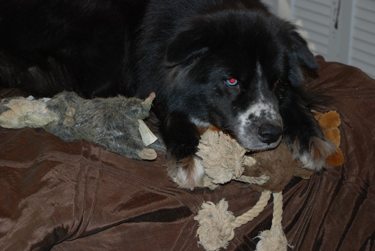 one, tries to slap the sad out me; though not gentle, his approach is perhaps the most proactive. He brings all of his favorite toys and whacks me with them (you haven’t lived until you’ve been beaten about the head and neck with a slobbery monkey…) until I give up and play fetch. Bear also likes to hug – he likes nothing better than to crawl up on your lap and lay with his head on your chest. It sounds sweet, but Bear is sort of a drooler, and he slaps if you quit petting him.