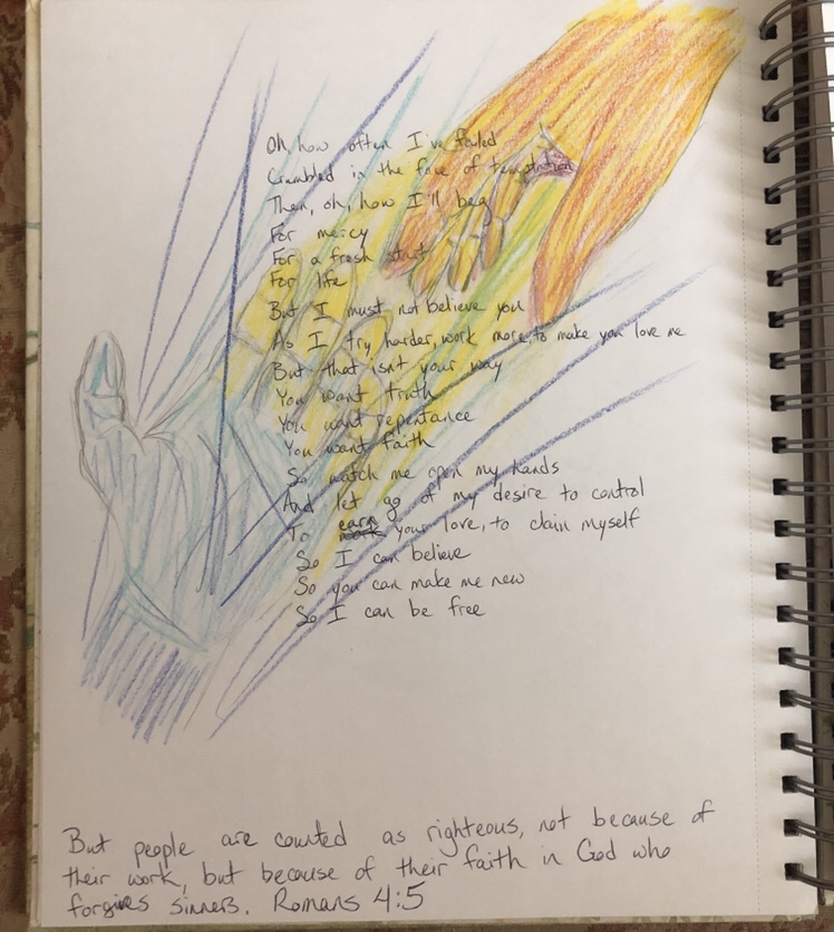 I am VERY slowly, but surely working my way chapter at a time through the book of Romans in the Bible. With each chapter, I read through, note the verses that stand out to me, and then boil it down to the “bottom line.” I choose the verse that most clearly states the main theme of the chapter and write it down somewhere on my blank page. As I sit with that verse a while, I draw what comes to mind as I meditate, and then I write a poem that reflects that meditation. I also go back to the verses that I marked and write more about them (I use the SOAP method for that, for the very few of you who wondered.) in a journal file on my computer.