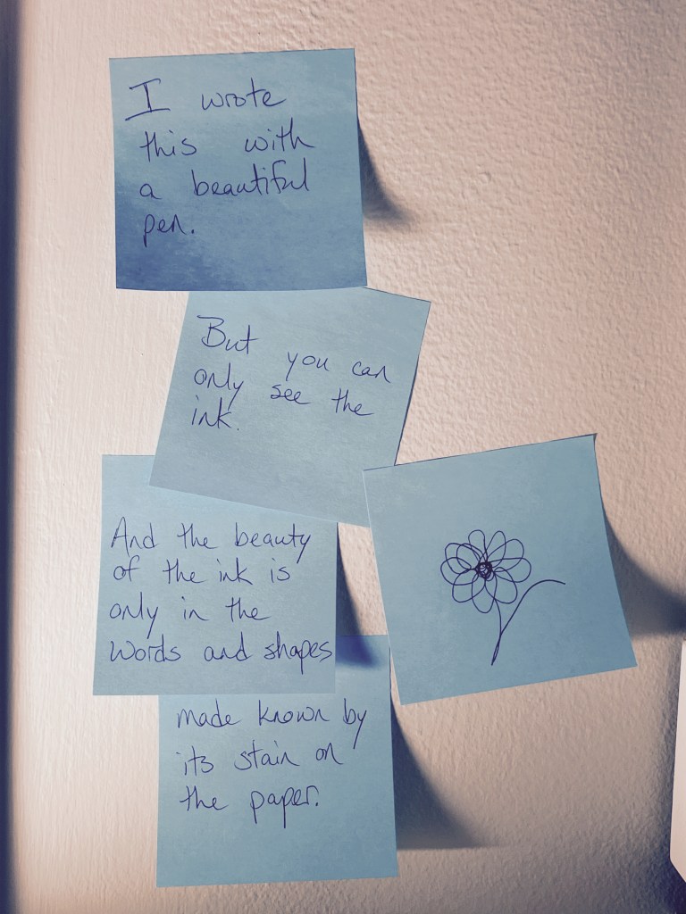 And the beauty of the ink is only in the words and shapes made known by its stain on the paper.