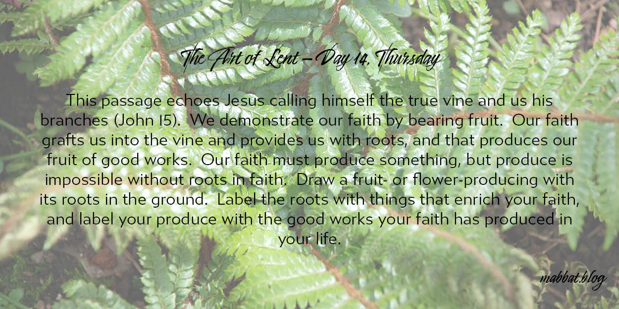 This passage echoes Jesus calling himself the true vine and us his branches (John 15). We demonstrate our faith by bearing fruit. Our faith grafts us into the vine and provides us with roots, and that produces our fruit of good works. Our faith must produce something, but produce is impossible without roots in faith. Draw a fruit- or flower-producing with its roots in the ground. Label the roots with things that enrich your faith, and label your produce with the good works your faith has produced in your life.