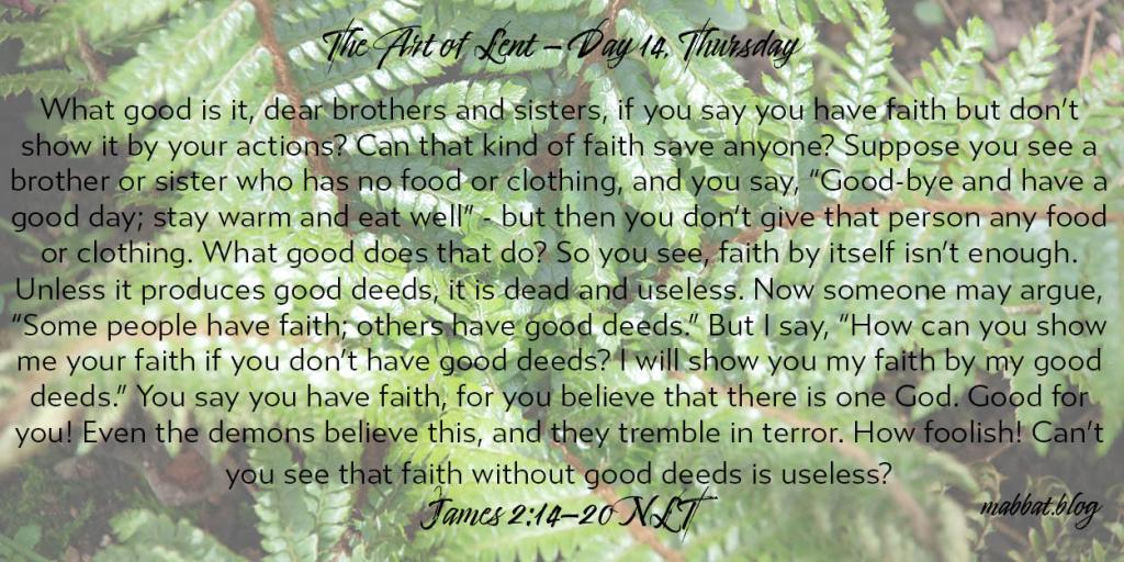 What good is it, dear brothers and sisters, if you say you have faith but don’t show it by your actions? Can that kind of faith save anyone? Suppose you see a brother or sister who has no food or clothing, and you say, “Good-bye and have a good day; stay warm and eat well” – but then you don’t give that person any food or clothing. What good does that do? So you see, faith by itself isn’t enough. Unless it produces good deeds, it is dead and useless. Now someone may argue, “Some people have faith; others have good deeds.” But I say, “How can you show me your faith if you don’t have good deeds? I will show you my faith by my good deeds.” You say you have faith, for you believe that there is one God. Good for you! Even the demons believe this, and they tremble in terror. How foolish! Can’t you see that faith without good deeds is useless?