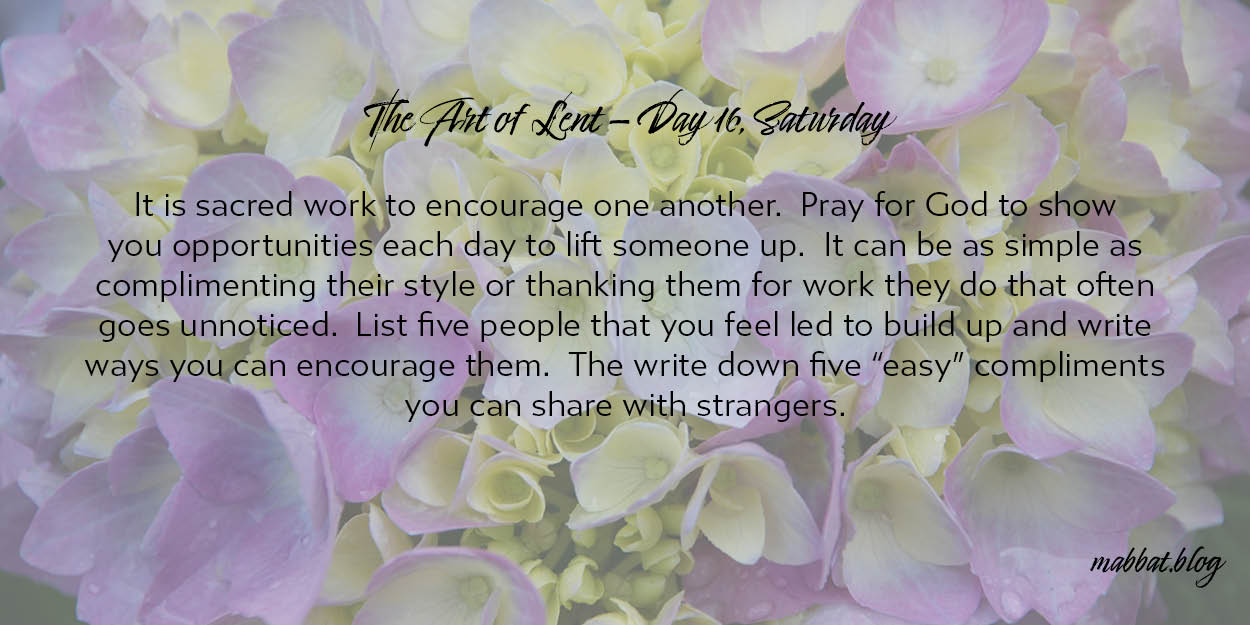 It is sacred work to encourage one another. Pray for God to show you opportunities each day to lift someone up. It can be as simple as complimenting their style or thanking them for work they do that often goes unnoticed. List five people that you feel led to build up and write ways you can encourage them. The write down five “easy” compliments you can share with strangers.