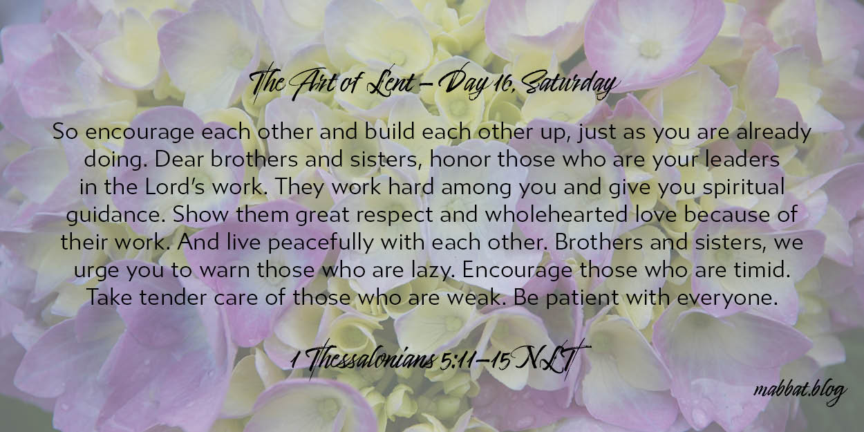 So encourage each other and build each other up, just as you are already doing. Dear brothers and sisters, honor those who are your leaders in the Lord’s work. They work hard among you and give you spiritual guidance. Show them great respect and wholehearted love because of their work. And live peacefully with each other. Brothers and sisters, we urge you to warn those who are lazy. Encourage those who are timid. Take tender care of those who are weak. Be patient with everyone.