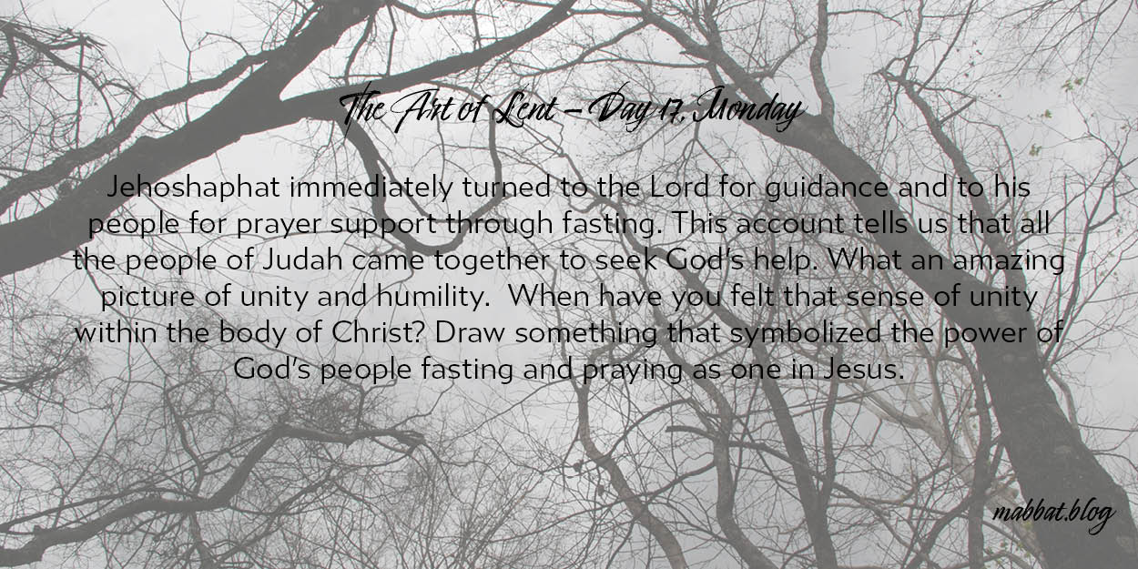 Jehoshaphat immediately turned to the Lord for guidance and to his people for prayer support through fasting. This account tells us that all the people of Judah came together to seek God’s help. What an amazing picture of unity and humility. When have you felt that sense of unity within the body of Christ? Draw something that symbolized the power of God’s people fasting and praying as one in Jesus.