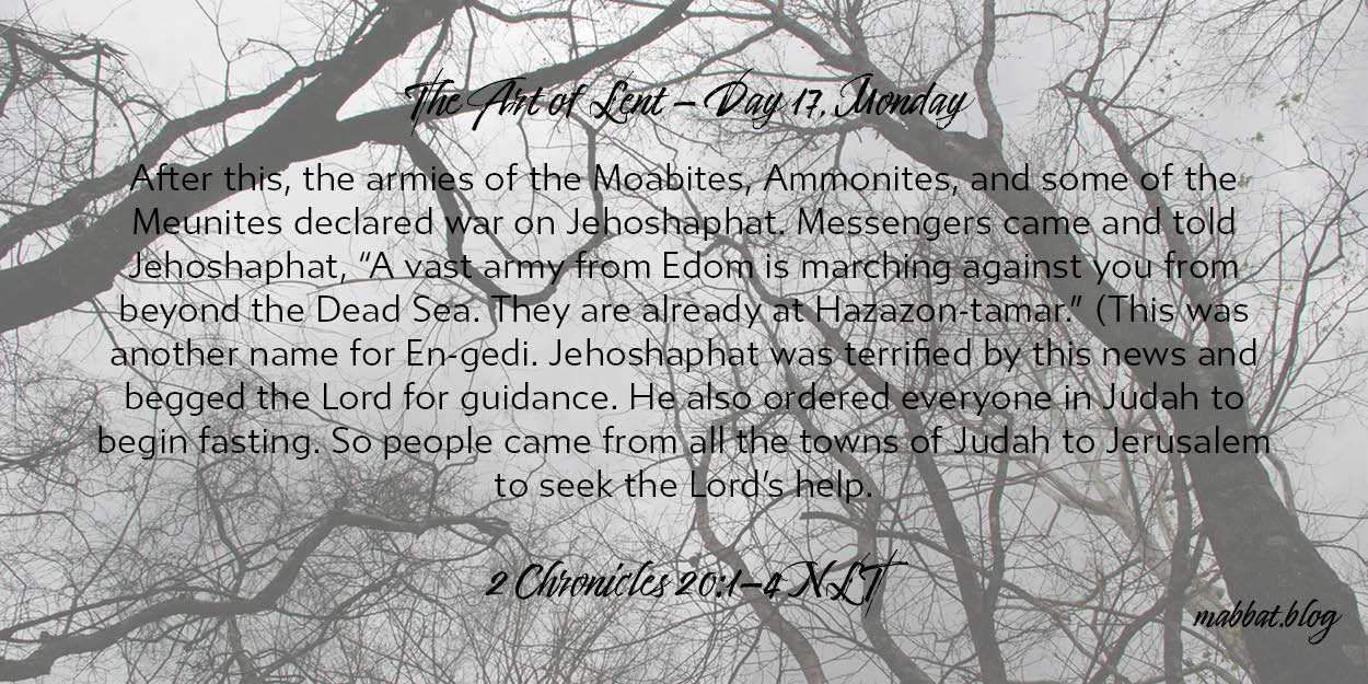 After this, the armies of the Moabites, Ammonites, and some of the Meunites declared war on Jehoshaphat. Messengers came and told Jehoshaphat, “A vast army from Edom is marching against you from beyond the Dead Sea. They are already at Hazazon-tamar.” (This was another name for En-gedi. Jehoshaphat was terrified by this news and begged the Lord for guidance. He also ordered everyone in Judah to begin fasting. So people came from all the towns of Judah to Jerusalem to seek the Lord’s help.