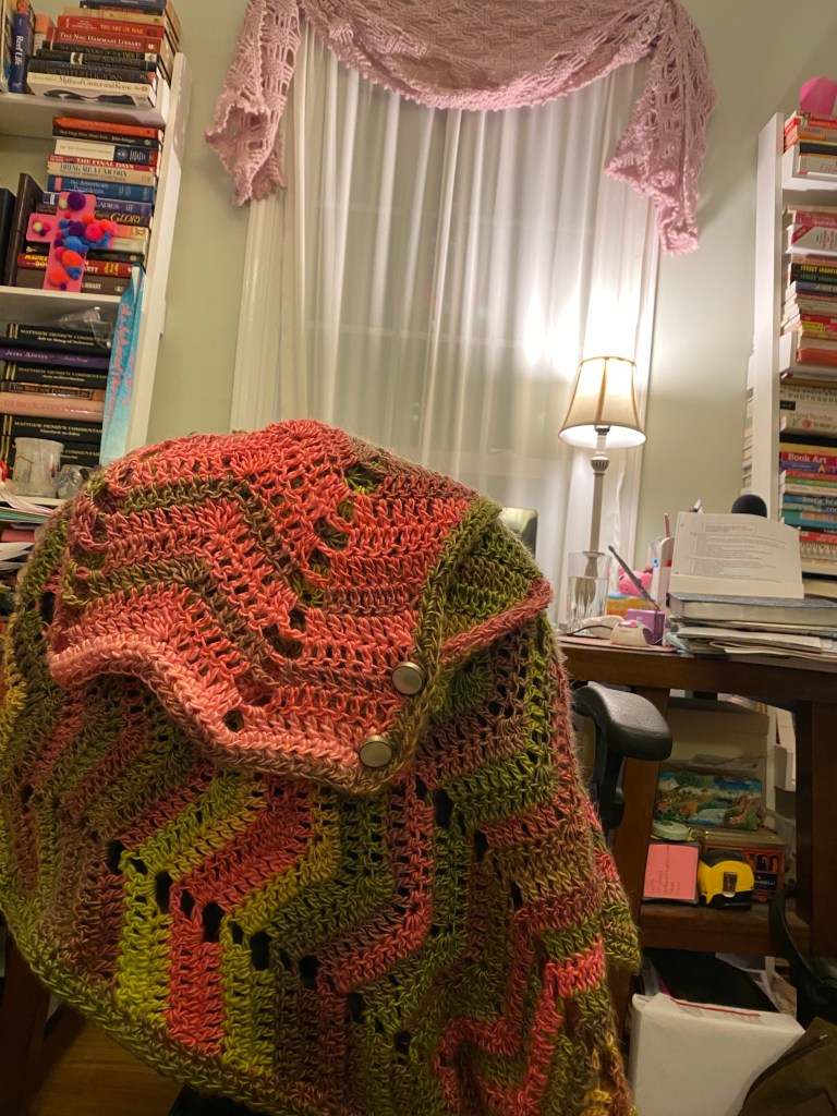 *Bonus shawl detail: adding buttons is the greatest new thing I learned. I put two on each end of the new shawl. I can button the ends to make loose sleeves and keep it on my arms but loose on my body. Or I can wrap my core and button it together at one shoulder without the awkwardness of trying to keep it wrapped when I move. Yay for buttons!