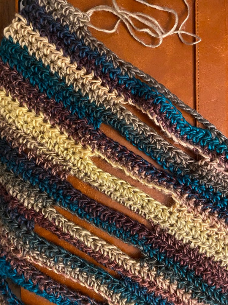 This week’s WIP is crochet. This will end up being a scarf with an oversize cable down the middle. Those weird ladder looking spaces will actually be crochet chained up the middle when it’s done, so it won’t be so wide and strange.